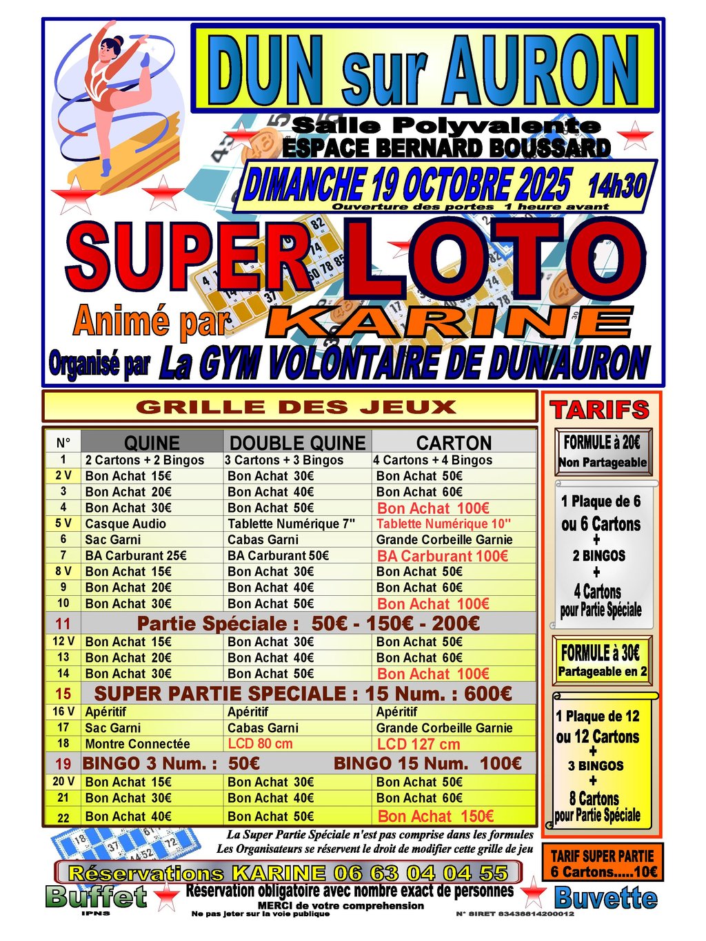 L'association "Gym Volontaire Dunoise" organise ses rifles, Dimanche 19 Octobre 2025 à 14h30 dans la Salle Polyvalente de l'Espace Bernard Boussard situé Rue de la Noraie.