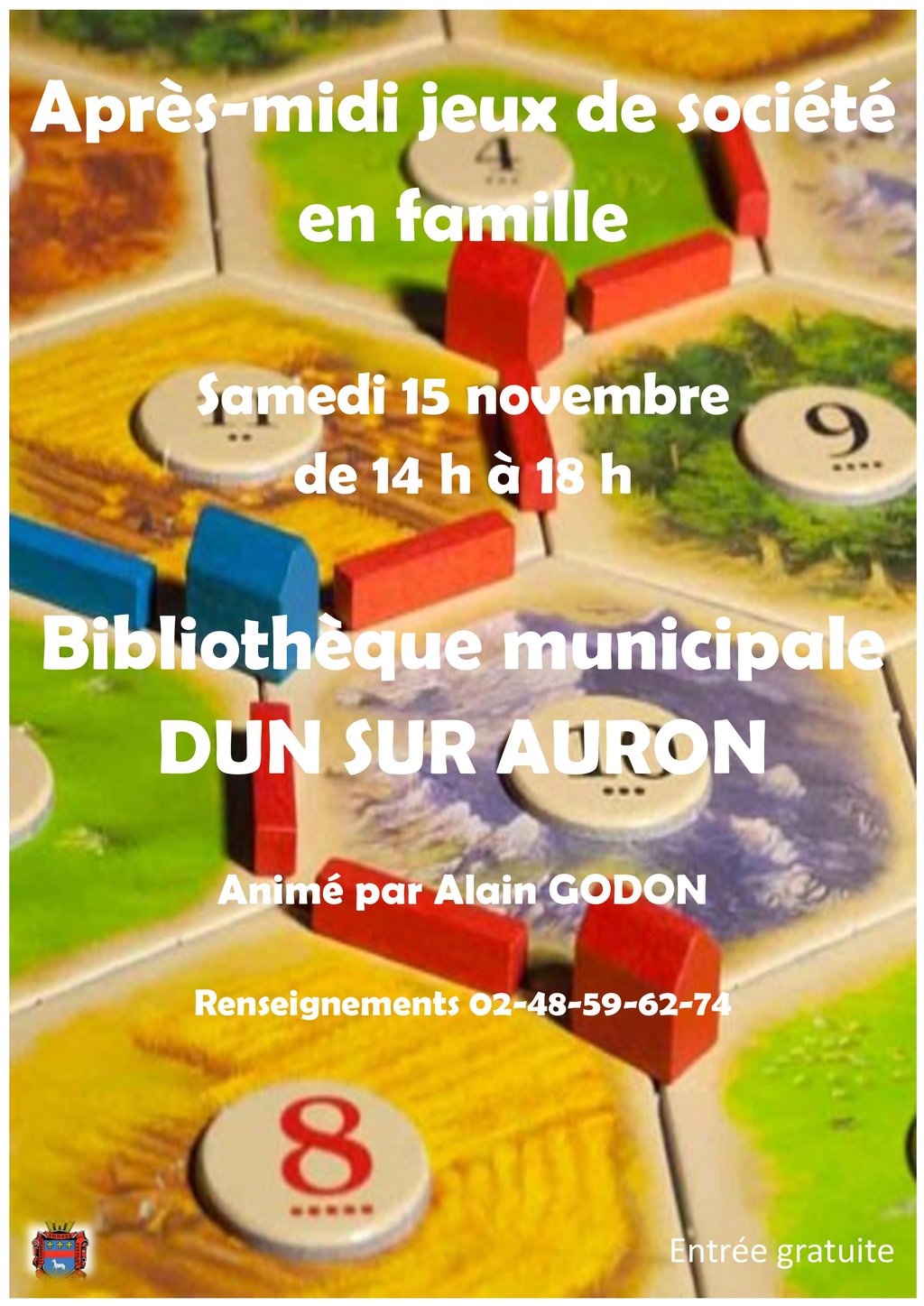 La Bibliothèque Municipale vous propose un après-midi jeux de société à partager en famille ou entre amis, Samedi 15 Novembre 2025 de 14h00 à 18h00 à la Bibliothèque Municipale.