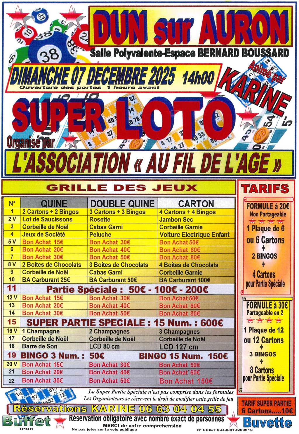 L'association "Au Fil De L'Âge" organise ses rifles, Dimanche 07 Décembre 2025 à 14h30 dans la Salle Polyvalente de l'Espace Bernard Boussard situé Rue de la Noraie.