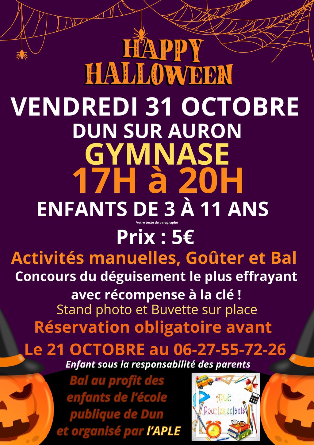 L'association des parents d’élèves de l'école élémentaire publique de Dun-Sur-Auron organise un Bal d'Halloween destiné aux enfants de 3 à 11 ans, Vendredi 31 Octobre 2025 de 17h00 à 20h00, dans le gymnase principal du Complexe Sportif Maurice Pinson situé Rue du Stade.