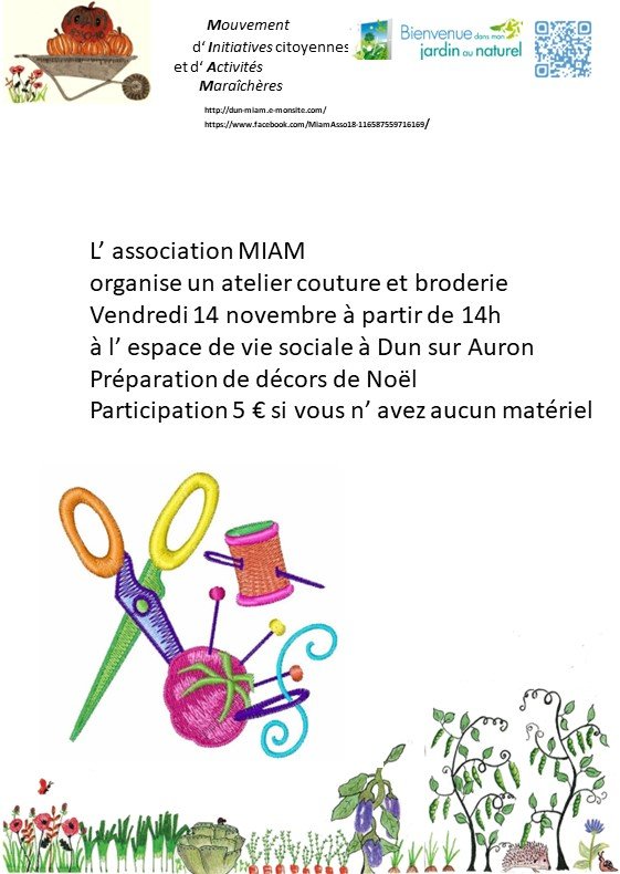 Le Mouvement d'Initiative citoyennes et d'Activités Maraîchères organise un atelier "Couture et broderie - Décors de Noël", Vendredi 14 Novembre à partir de 14h00, à leur espace de vie sociale "Au potager du MIAM" situé au 12 Grande Rue.