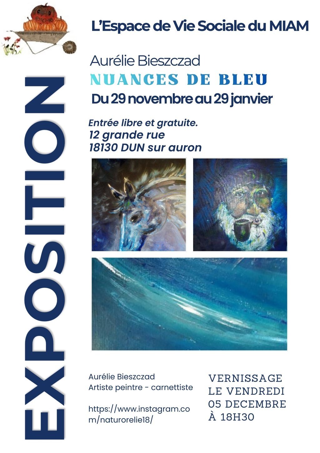 Le Mouvement d'Initiative citoyennes et d'Activités Maraîchères organise le vernissage de leur exposition des peintures de l'artiste Aurélie Bieszczad sur le thème "Nuances de bleu", Vendredi 05 Décembre 2025 à 18h30 à leur espace de vie sociale "Au potager du MIAM" situé au 12 Grande Rue.